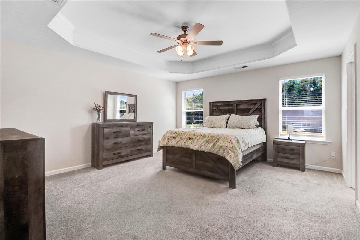 Discover the perfect blend of style and comfort in this stunning 4-bedroom, 3-bath home. Situated on a spacious 0.58-acre cul-de-sac lot, this residence is designed for modern living, offering ample space both inside and out. The main floor is bright and airy, with an open-concept living room that flows seamlessly into the kitchen. Highlights include a dedicated coffee bar area and a large pantry. A convenient drop zone and a main-level guest bedroom with a full bath add to the home's functionality. Upstairs, beautiful oak stairs lead to a spacious loft and three additional bedrooms. The impressive primary suite features an elegant tray ceiling, a spa-like bathroom with dual vanities, a soaking tub, and a separate shower, along with a huge walk-in closet. The extended back patio is perfect for outdoor entertaining.